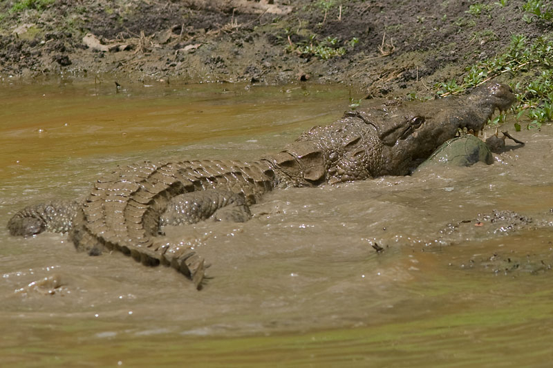 ![]() | Gambia, Abuko-Nationalpark (2007). Seit geraumer Zeit stehe ich in einem dreckigen, dunklen und stickigen Beobachtungshüttchen. Durch Löcher im Bretterverhau habe ich einen halbwegs freien Blick auf den vor mir liegenden Tümpel. Reiher, Löffler, Hammerköpfe und Tauben fliegen regelmäßig ein, um im scheinbar flachen Wasser nach Beute zu suchen oder auch nur um aus der trüben Pfütze zu trinken. Ein eigentlich friedlicher Anblick. Und dennoch ist die ständige Vorsicht, ja sogar die Furcht der Vögel vor lauernden Gefahren deutlich spürbar. In der Mitte des Teichs dreht eine Schildkröte ihre Runden. Ohne jeglich Vorankündigung explodiert das Wasser scheinbar vor mir. Ein etwa drei Meter großes Krokodil taucht auf, schnappt sich mit krachenden Geräuschen die Schildkröte und zieht sie in die Tiefe. Schnell beruhigt sich das Wasser wieder. Still und friedlich liegt der Teich vor mir. | ||